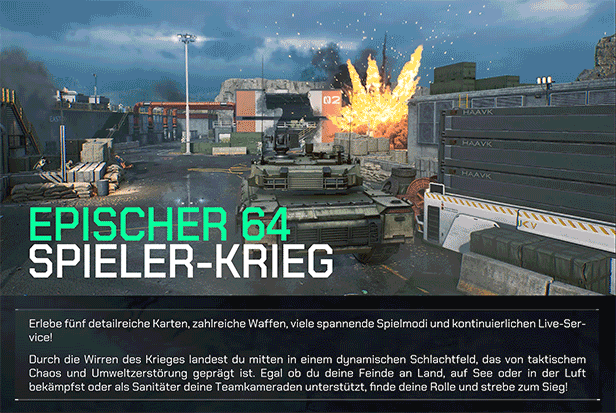 - Krieg: Bekämpfe den Feind zu Land, zu Wasser und in der Luft in wahrhaft epischen 32-vs-32-PvP-Kämpfen mit einer großen Auswahl an Fahrzeugen und einzigartiger taktischer Ausrüstung.